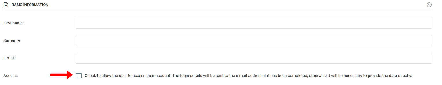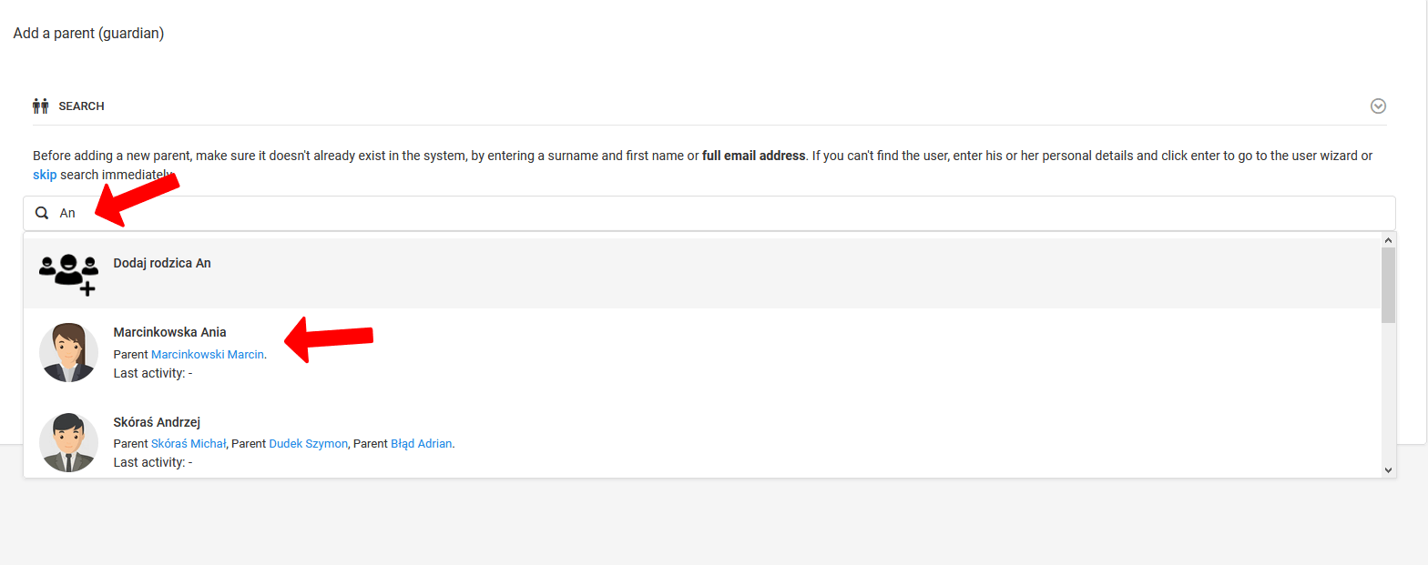 Si el padre aún no está en el sistema, los campos debajo del motor de búsqueda deben completarse manualmente. Aquí decidirá si desea dar el nombre de usuario y la contraseña al padre. Para hacerlo, marque la casilla gris. Si ingresa la dirección de correo electrónico del padre y marca el acceso, se enviará un correo electrónico a esa dirección con los datos de inicio de sesión.